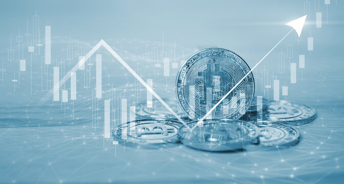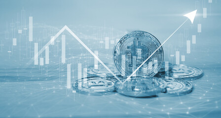 Bitcoin coin representing digital crypto currency technology, financial foreign exchange market, increasing value price and trading wealth, graphical graph chart abstract blue background