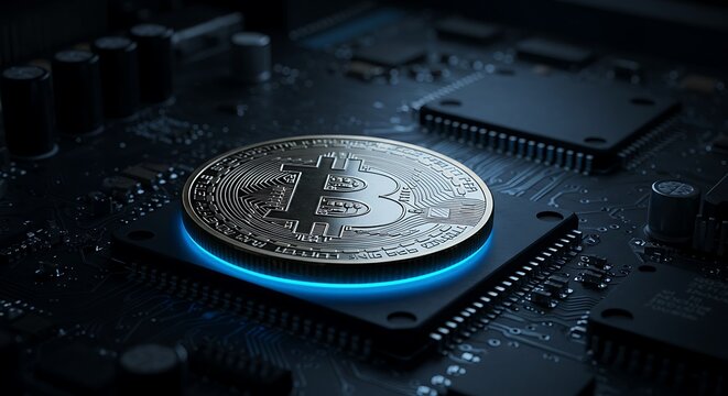 A single, glowing physical Bitcoin coin resting on a dark, complex computer motherboard circuit. Cool blue and futuristic ambient light, focus on the coin's texture.