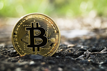 Gold bitcoin token standing on glossy black surface reflecting circuit detail