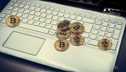 Close up of bitcoin crypto currency coins and american dollar banknotes. USA dollars. Money background. Crypto currency golden bitcoin coin