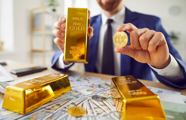 Rich man, the boss, sits at a table strewn with cash money, holding a gold bar and a bitcoin coin, symbolizing financial prowess and wealth in the cryptocurrency market or online trading.