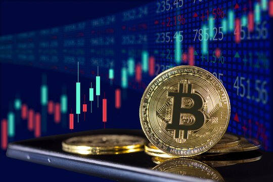 Bitcoin with red chart down. Crypto and Bitcoin cryptocurrency stock trading background concept. Golden bitcoin over many international money coins with abstract trading red market data chart