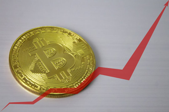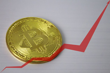 golden coins of bitcoins, the red arrow of the graph is directed upwards