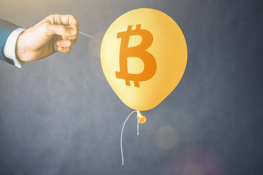 Bitcoin cryptocurrency symbol on yellow balloon. Man hold needle directed to air balloon. Concept of finance risk.