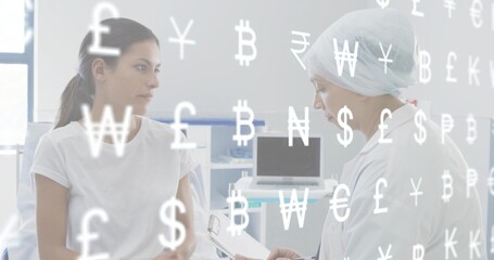 Sitting patient white tee, doc white coat surgical cap noting clipboard in clinic, currency overlay