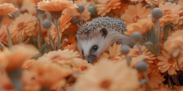 A small white hedgehog is curled up in a bed of orange flowers. The scene is peaceful and serene, with the hedgehog blending in with the flowers and the bright colors of the petals