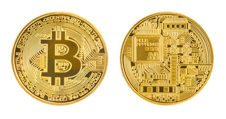 Auction gavel and bitcoin cryptocurrency money on a wooden desk, close-up. Law Gavel and golden bitcoin symbol on white background with copyspace