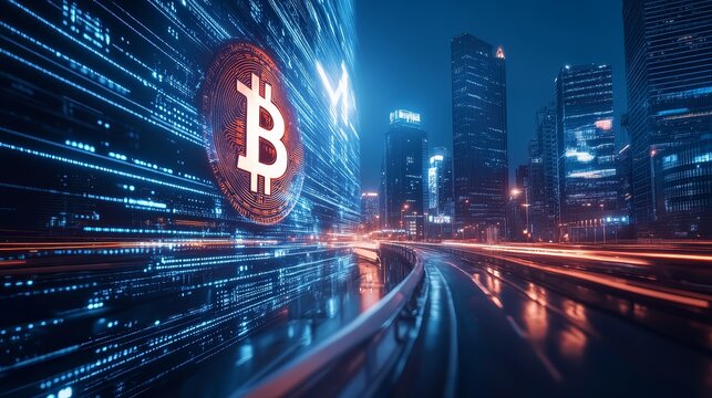 Bitcoin Cryptocurrency Symbol and Cityscape at Night