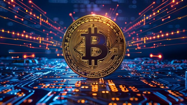 Abstract bitcoin glowing symbol futuristic circuit board digital representation of cryptocurrency financial background