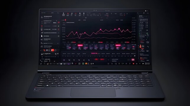 A sleek dark laptop displays a dynamic stock market dashboard with real-time data and graphs. The interface showcases stock prices, market trends, and financial indicators.