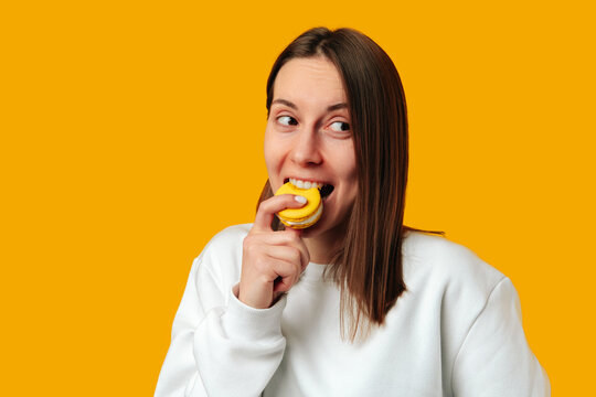 Studio portrait of a playful young woman taking a bite of a yellow macaroon over yellow background.