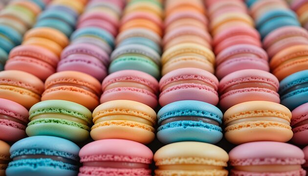 Colorful rows of assorted French macarons arranged neatly displaying vibrant pastel shades and