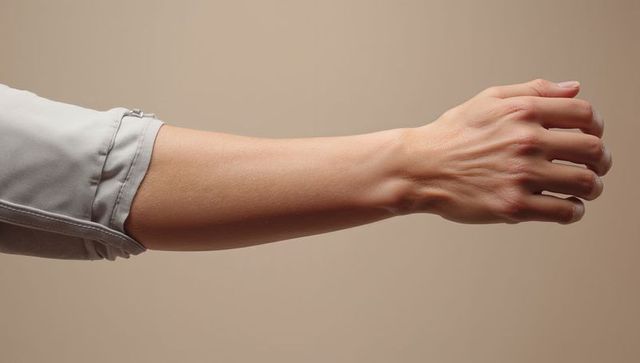 Man tapping smart jacket sleeve touchscreen interface wearable tech control futuristic lab