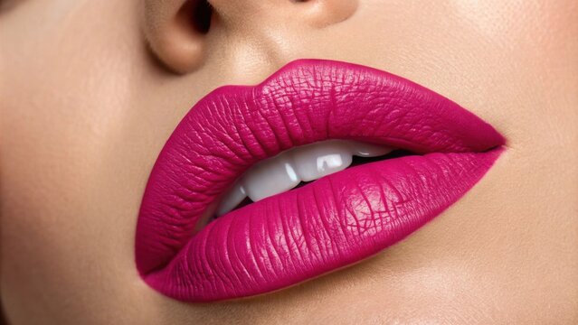 In this captivating portrait a dazzling fuchsia hue envelops the lips. The focus is on the bold act of biting the lower lip creating a and inviting appearance. The smoothness of
