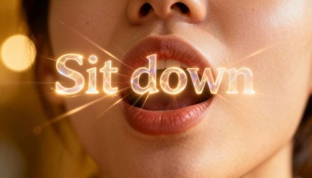 Whispering lips sending holographic come here neon text over golden bokeh closeup