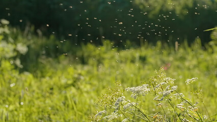 Small midges . Creative.A lot of flies are circling around the flowers and the sun is shining brightly on them.