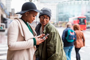 Stylish female friends using mobile phone in London