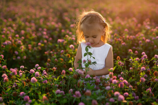 A little girl with a bouquet of flowers in a clover field is bitten by mosquitoes. A child in the rays at sunset. Insect bites.