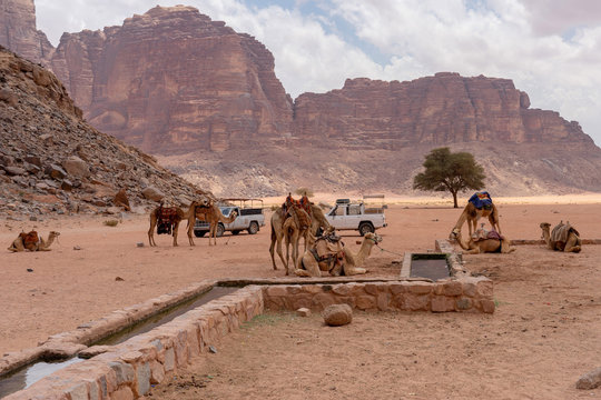 Camels rest at Lawrence of Arabia spring. Wadi Rum desert, Jordan