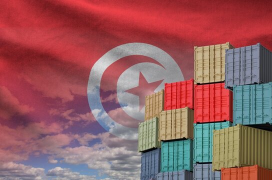 Tunisia flag and big stack of shipping cargo containers in docks with sky background close up