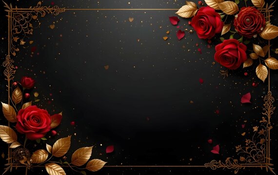 Elegant black and gold background with luxurious red roses and golden leaves, perfect for invitations, celebrations, or romantic-themed designs
