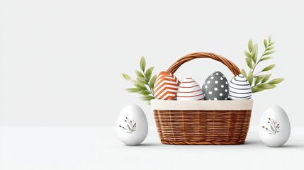 A wicker basket with decorated Easter eggs and leaves sits on a white surface, flanked by two white eggs with floral designs.