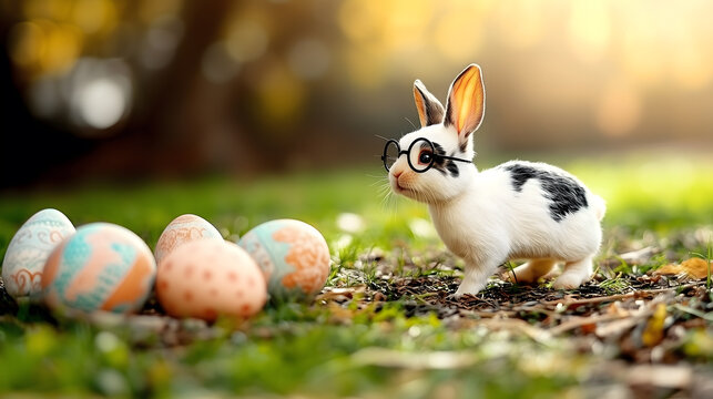 Colorful easter eggs in lush spring grass with cute bunny graphics