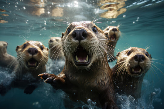 A group of playful otters engaged in a synchronized swimming routine, splashing water joyfully. Concept of aquatic acrobatics. Generative Ai.