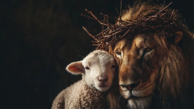 Biblical symbolism lion and lamb Jesus crowned with thorns on black background. Concept Religious Art, Lion and Lamb, Biblical Symbolism, Jesus Crown of Thorns, Black Background