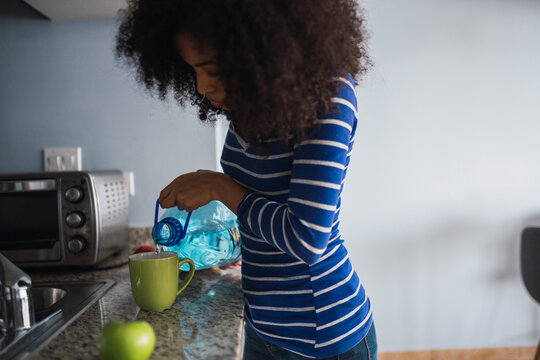 Young woman pouring water into a mug in her kitchen