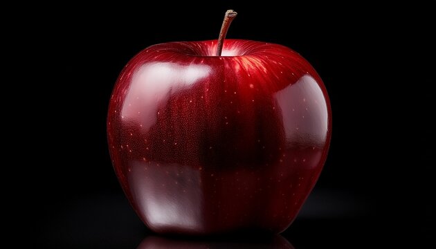 shiny dark red apple with stem against black background