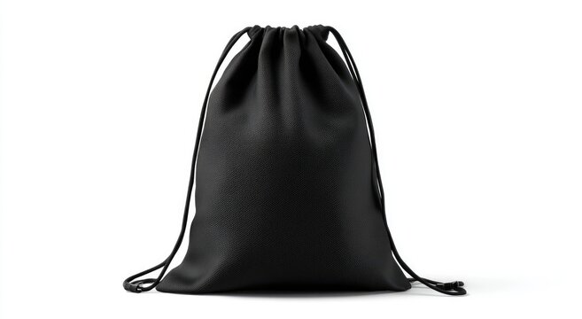 A simple black drawstring bag, seemingly made of a smooth, possibly leather-like material, sits against a stark white background.  The bag is cylindrical with a gathered top and long cords