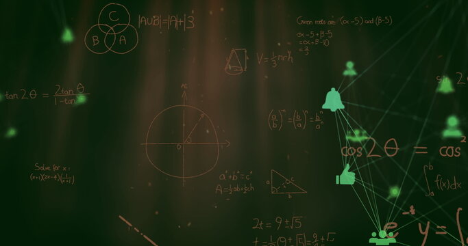 Image of network of connections with icons over mathematical equations on black background