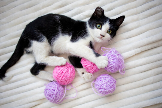 A cute little black and white kitten is playing on the bed on a white plaid with multicolored balls of knitting threads.