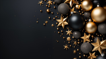 Holiday decorations with black and gold ornaments and festive stars on a dark background