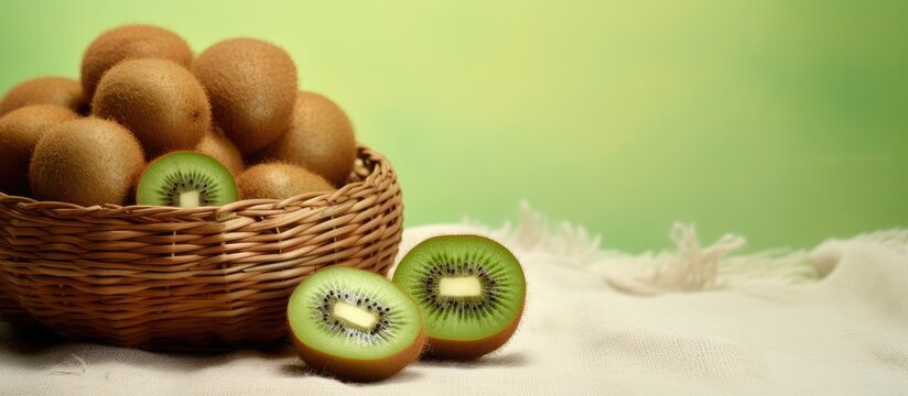 Kiwi fruit in a black basket on isolated pastel background Copy space
