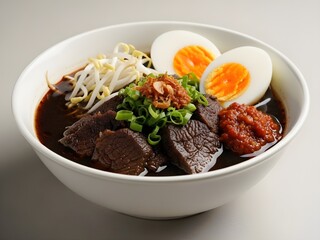 High-quality photo of Rawon, Indonesian black beef soup with keluak, beef, bean sprouts, and egg, ideal for restaurant menus, brochures, and commercial food use.