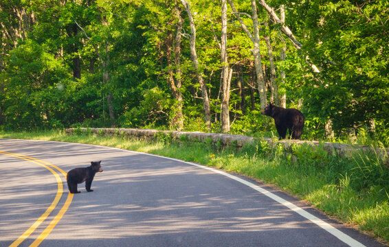 Mom and Cub Blackbear Crossing the Road at Shenandoah National Park along the Blue Ridge Mountains in Virginia