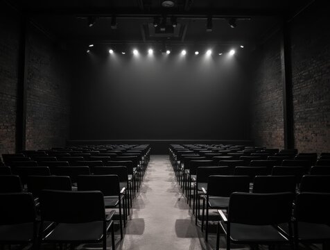 Symmetrical rows of metal chairs in a moody black box theater, exposed brick texture, focused stage lights, and a high-contrast, industrial ambiance.
