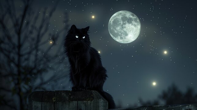 A black cat is sitting on a wooden post in front of a full moon. The scene is dark and mysterious, with the cat's eyes glowing in the moonlight. Concept of calm and tranquility