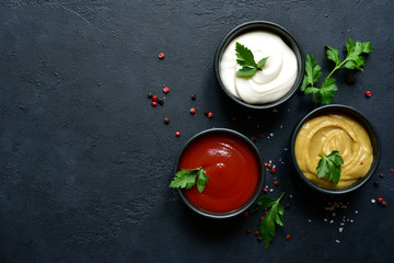 Set of popular sauces in a black bowls. Top view with copy space.