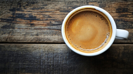 A freshly brewed cup of coffee sitting on a wooden tabletop