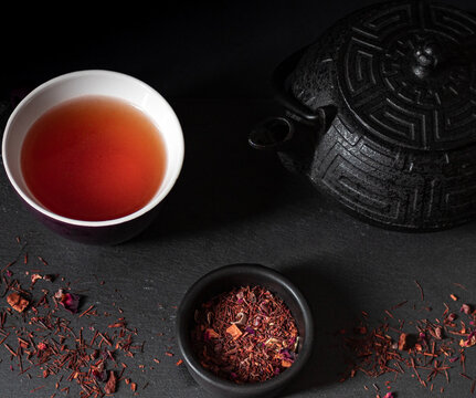A white bowl holds red powder against a black backdrop ..Or, for a more succinct version:..White bowl with red powder on black
