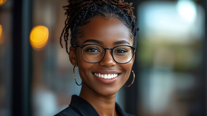 Portrait of happy African American businesswoman standing with crossed arms in front of her desk at modern office