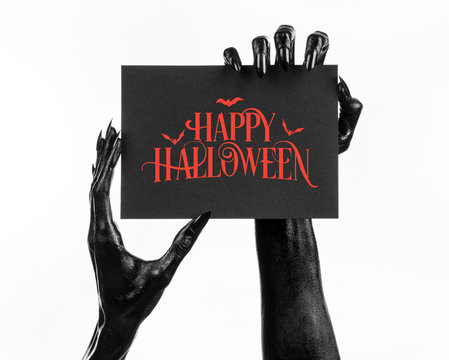 Postcard and Happy Halloween theme: black hand of death holding a paper card with the words Happy Halloween on a white isolated background in studio