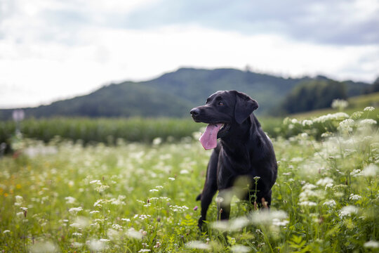 Portrait of an Labrador Retriever standing in a field with flowers. Black Dog happy in the nature.