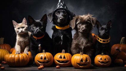 Group of dogs and cats in Halloween costumes with pumpkins on dark background