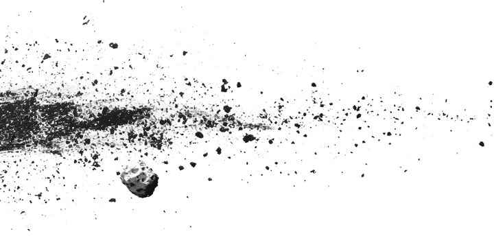PNG. A line of small black particles on white background, with an asteroid in the upper left corner. The debris is scattered across all three edges and has no shadows or reflections