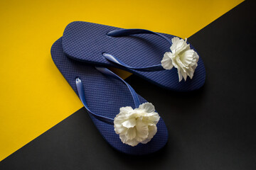 Colorful summer female fashion outfit. Black and white straw hat, flip flops