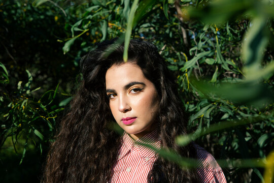 Beautiful young girl with long black hair posing between the trees
